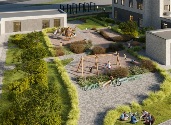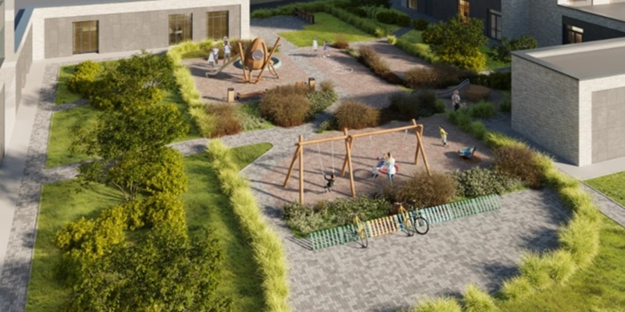 Проектом предусмотрено продуманное благоустройство – здесь проложат прогулочный бульвар, посадят высокие деревья и кустарниковые растения, установят декоративные арки с подсветкой. Для семейного отдыха и мероприятий обустроят площадь для общественных мероприятий. Во внутреннем дворе расположится детская площадка и спортивные тренажеры. Дополнительно жителям откроется доступ к эксплуатируемой кровле с местами для отдыха и панорамным видом.